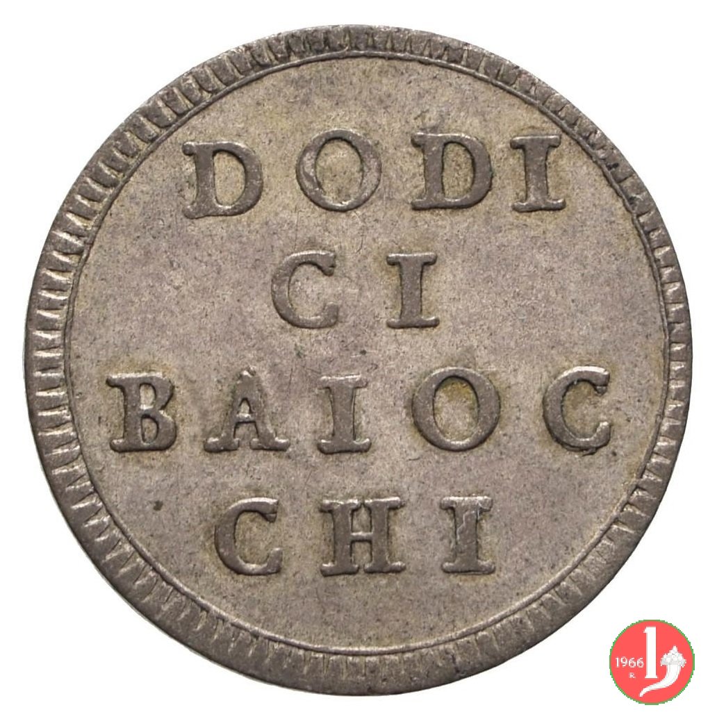 muraiola da 12 baiocchi Dritto: Chiavi decussate con doppi cordoni e fiocchi. Inizio della leggenda da sinistra in basso. PIVS - SEX - TVS - In basso: 1 - 79 - 3 Verso: DODI || CI || BAIOC || CHI | |