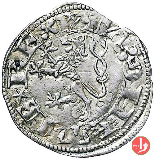 Grosso di Giovanni di Boemia Dritto: + JOHANNES, busto di Giovanni di Lussemburgo semifrontale a sinistra con corona. Verso: BOHEMIE ![]() REX ![]() , leone con coda biforcuta e coronato rampante a sinistra. |
