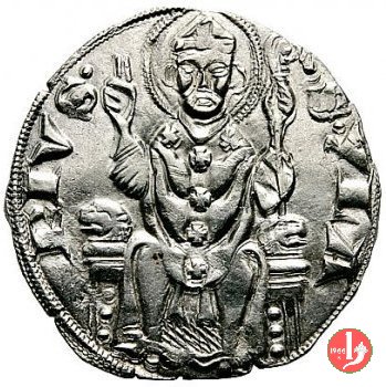 Grosso (1269-1299) Dritto: Nel campo, all'interno di un circolo, croce patente ai cui angoli si alternano due globetti e due stelle a sei raggi. Intorno ∴ ✠ ∴ DE PARMA Verso: Sant'Ilario assiso in abito pontificale, con mitra in capo, pastorale nella sinistra, e colla destra alzata in atto di dare la benedizione. Intorno • S • YLA RIVS •. | |