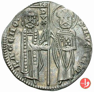 Grosso Dritto: • RA • GENO • / • S • M • VENETI • Lungo l'asta DVX San Marco stante a destra, di fronte, tiene nella sinistra il libro dei Vangeli e con la destra porge il vessillo al Doge stante a sinistra, di fronte. La banderuola con la croce è volta a sinistra. ai lati del nimbo, IC / XC | |