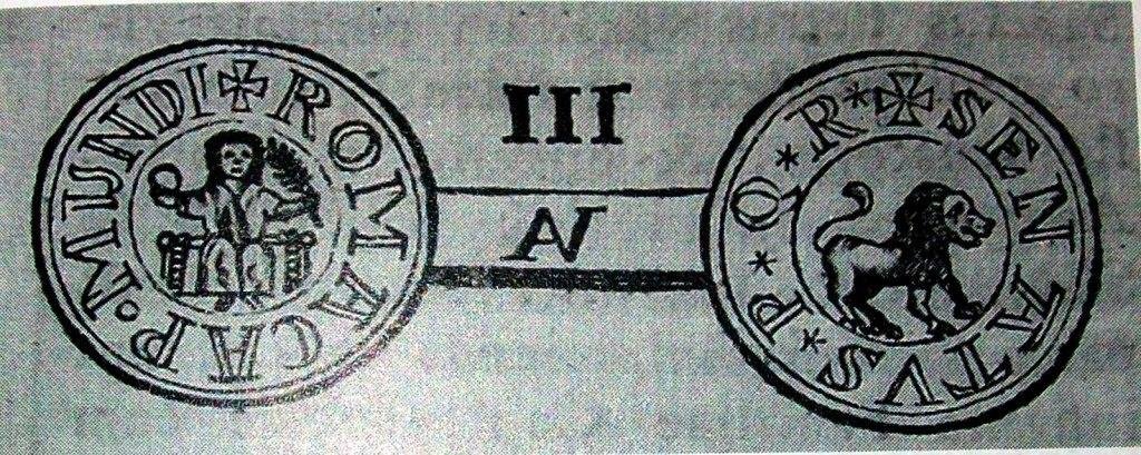 Romanino d'oro Dritto: ✠ SENATVS*P*Q*R* Leone passante a dx in c. liscio. Roma seduta in trono con globo nella dx e palma nella sx in c. liscio. |
