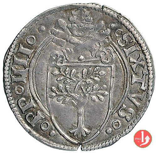 Ducato Papale Dritto: •SIXTVS.PP ![]() _![]() QVARTVS. /Stemma ottagono sormontato da chiavi decussate con conrdone e da tiaraVerso: PETRV'__PAVLVS ![]() /S.Pietro (a destra) e S.Paolo (a sinistra), nimbati, di fronte l'uno verso l'altro; Pietro con chiave e libro, Paolo con spada e libro; tra le due figure in b. ![]() In Esergo MAR | |