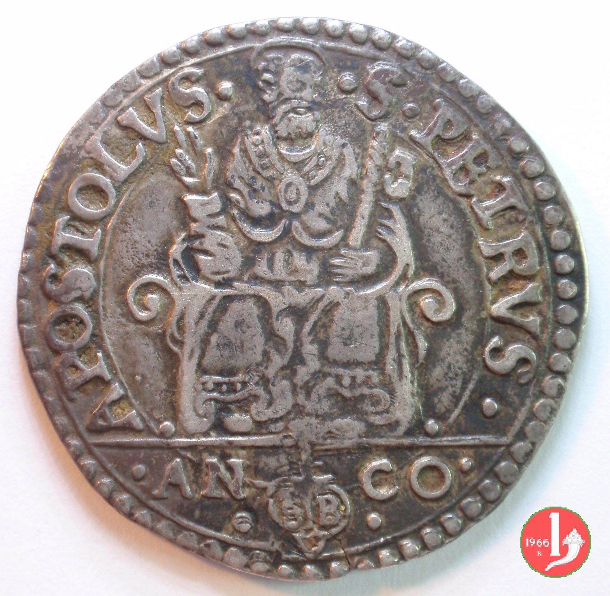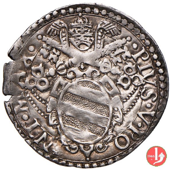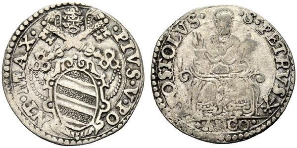Testone - I t. Dritto: • •PIVS •V •PO__NT •MAX • • /Stemma ovale in cornice a trafori volute e punto sopra la cimasa, sormontato da chiavi dec. e tiara Verso: •S •PETRVS ![]() __ •APOSTOLVS • /S.Pietro nimbato seduto di fronte, testa leggermente a destra, benedice con la destra e chiavi nella sinistra; in Esergo •ANCO • | |