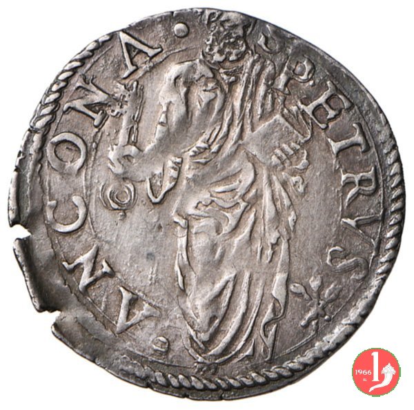 Giulio Dritto: •PIVS •V •PO__NT •MAX • /Stemma ovale in cornice a trafori con ai lati due maschere, sormontato da chiavi dec. e tiara Verso: S PETRVS ![]() __ •ANCONA • /S.Pietro nimbato in piedi di fronte, nella destra chiavi erette rivolte in fuori e nella sinistra libro aperto | |