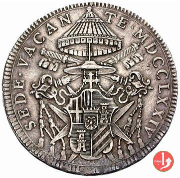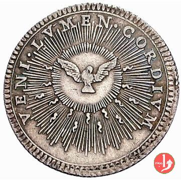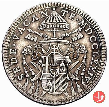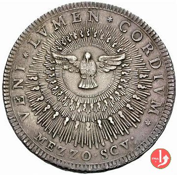 Mezzo scudo romano Dritto: Stemma del Card. Rezzonico a targa sagomata, sormontato da padiglione e chiavi. Legenda da sinistra: SEDE • VACAN - TE • MDCCLXXIV Verso: Colomba radiante entro cerchio di fiammelle sopra altro semicerchio di fiammelle, legenda da sinistra VENI * LVMEN * CORDIVM *, in basso il valore: MEZZO • SCV • | |