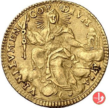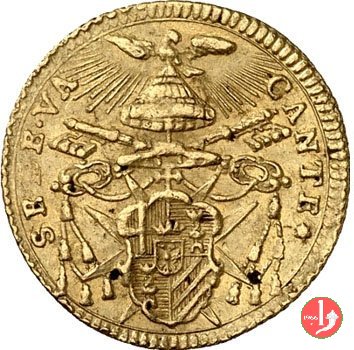 Zecchino Dritto: Stemma del Card. Rezzonico ovale sagomato, sormontato da padiglione e chiavi. Legenda da sinistra: SEDE • VA - CANTE * Verso: La Chiesa seduta su nubi, legenda da sinistra VENI • LVMEN - COR - DIVM - 1774 |