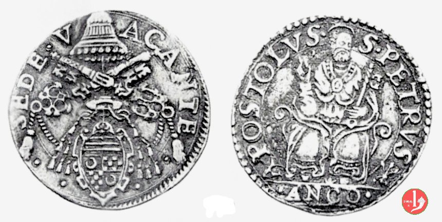 Testone Dritto: •SEDE •V__ACANTE • /Stemma ovale del Card. Vitellozzo Vitelli in cornice a trafori e volute con croce e cappello, sormontato da chiavi dec. cordone fiocco e padiglione Verso: •S •PETRVS • ![]() __ •APOSTOLVS • /S.Pietro nimbato seduto su trono, benedice con la destra e con la sinistra tiene chiave eretta appoggiata al ginocchio; in Esergo •Anco • |