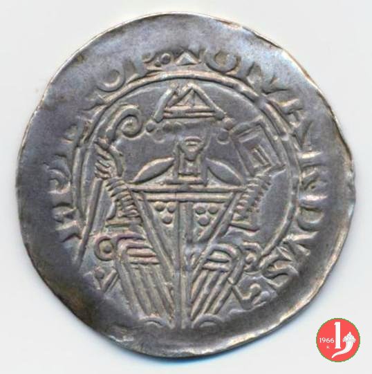Denaro con EPISCOP Dritto: + GIVARDVS EPISCOP' (globetto), il Vescovo seduto con pastorale e libro Verso: + CIVITAS TERGESTVM, tempio tra due campanili su arco | |