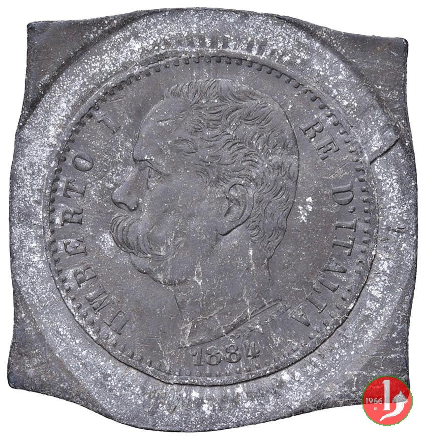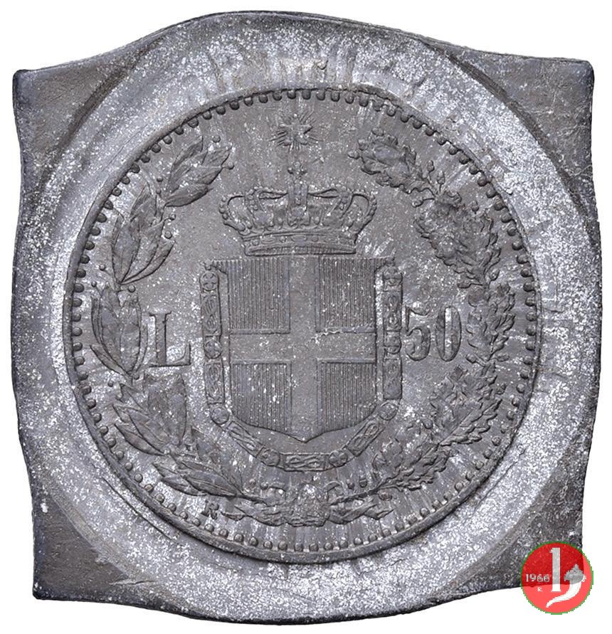 impronta in piombo su piastra 50 lire Dritto: Testa nuda, volta a sinistra. Sul taglio del collo il nome dell'autore (SPERANZA). In basso la data (1884). Intorno, circolarmente UMBERTO I RE D'ITALIA. Verso: Entro rami di lauro e di quercia, stemma sabaudo coronato e ornato del collare della S.S. Annunziata, ai lati del quale l'indicazione del valore (L. / 50). In basso , a sinistra, il segno di zecca (R). In alto, stella fiammeggiante. |