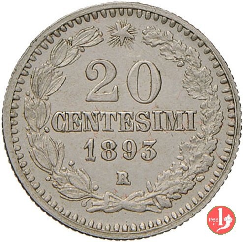 progetto 20 centesimi Dritto: Testa nuda volta verso sinistra. Intorno, circolarmente, UMBERTO I RE D'ITALIA. Verso: Nel campo, su quattro righe, in corona di rami di lauro e di quercia, l'indicazione del valore, la data e il segno di zecca (20/CENTESIMI/1893/R). In alto, stella raggiante. |