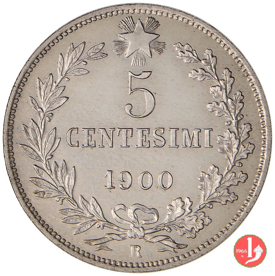 prova 5 centesimi Dritto: Testa nuda volta verso sinistra. Sotto il collo, il nome dell'autore (SPERANZA), lungo il bordo. Intorno, circolarmente, UMBERTO I RE D'ITALIA. Verso: Nel campo, su tre righe, in corona di rami di lauro e di quercia, l'indicazione del valore e la data (5 /CENTESIMI/1900). In alto, stella raggiante, e in basso, il segno di zecca (R). |
