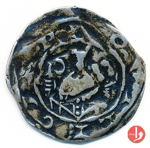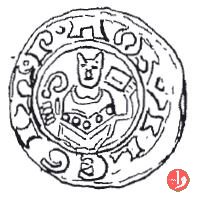 Denaro Dritto: AQVILEGIA (globetto) P (globetto), busto frontale del Patriarca con pastorale nella mano destra e libro nella sinistra Verso: Tempio con due torri con un globetto sopra ciascuna delle tre cuspidi; in alto croce e in esergo globetto | |