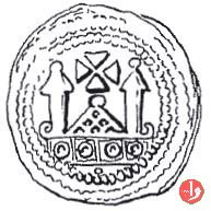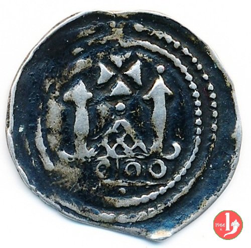Denaro AQUILEGIA P Dritto: HQVILEGIH.P., tra due cerchi lineari busto frontare con mitra che regge nella mano destra pastorale e nella sinistra libro. Verso: Tempio con frontone triangolare e due torri con tetto triangolare terminante con globetto. Tra le torri croce e globetto. Al di sotto del tempio due linee parallele terminanti ad uncino, intercalate da 4 anelli, all'esergo globetto. Doppio contono perlinato. |