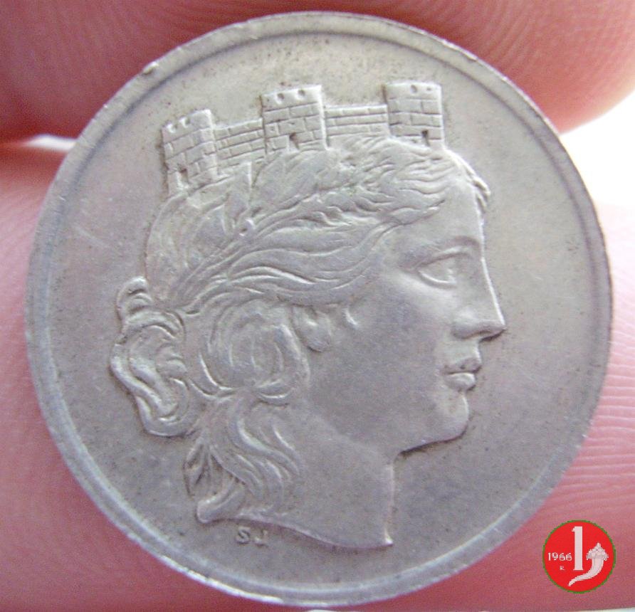 progetto 25 centesimi 1918 Obverse: testa con corona turrita a destra; circolarmente a destra, REGNO D'ITALIA e in basso, tra due stelle, la data. Reverse: nel campo, "25", in alto, circolarmente, "CENTESIMI" e nel basso nodo Sabaudo tra due rami d'alloro, con ancora sotto, il segno di zecca e circolarmente a sinistra "PROVA S.J.". | |