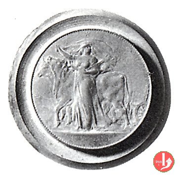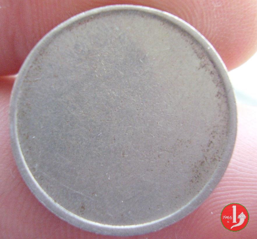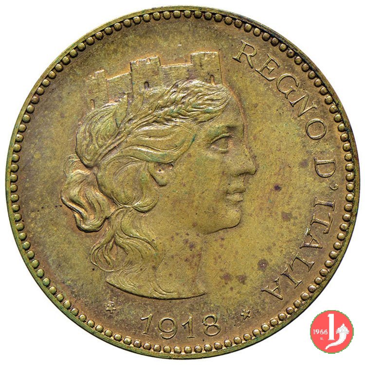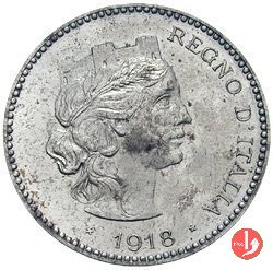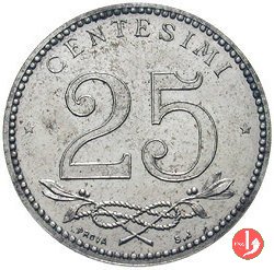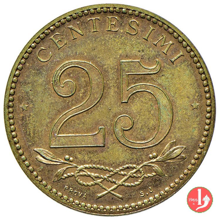 prova fuoriclasse 25 centesimi 1918 Obverse: testa con corona turrita a destra; circolarmente a destra, REGNO D'ITALIA e in basso, tra due stelle, la data. Reverse: nel campo, "25", in alto, circolarmente, "CENTESIMI" e nel basso nodo Sabaudo tra due rami d'alloro, con ancora sotto, il segno di zecca e circolarmente a sinistra "PROVA S.J.". | |