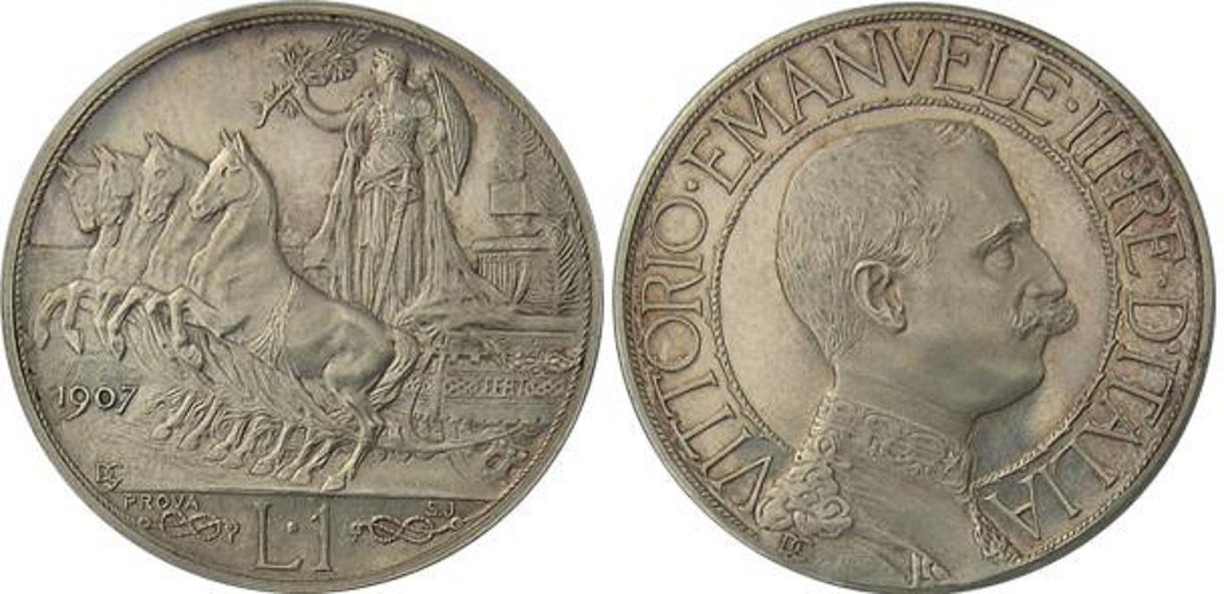 progetto 1 lira 1907 Obverse: Figura allegorica dell'Italia con scudo, elmo e ramo di quercia, su quadriga veloce a sinistra. la quadriga è ornata con fiori e FERT; sotto le zampe dei cavalli, la data, nell'esergo, il valore tra due nodi, con sopra il segno di zecca. nella linea dell'esergo, a sinistra,"prova", e a destra "S.J.". Reverse: busto con testa nuda volta a destra, contornato da: VITTORIO • EMANUELE • III • RE • D'ITALIA cerchiato. dietro il collo, il nome dell'autore "D. Calandra". | |