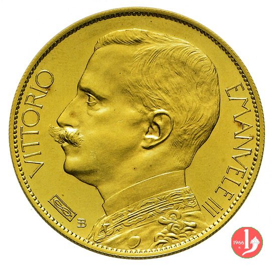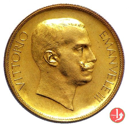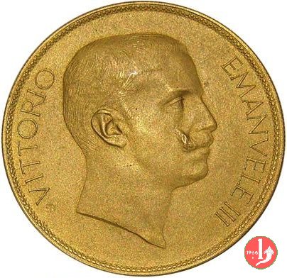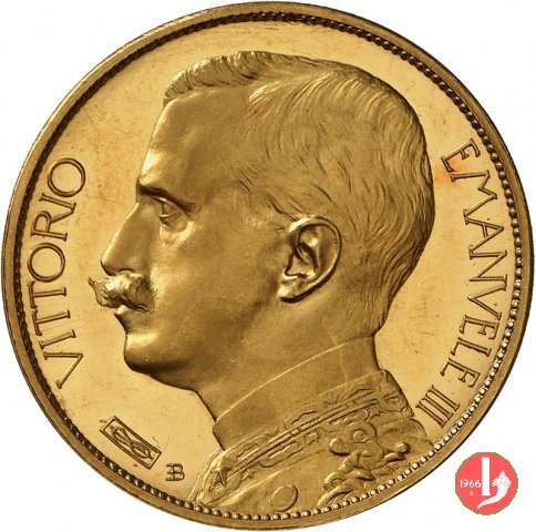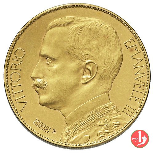 100 lire 1908 Obverse: busto con testa nuda in uniforme a destra; dietro monogramma E B (Egidio Boninsegna); attorno VITTORIO EMANVELE III. Reverse: Italia gradiente tra valore e data, a sinistra, con aratro; ai lati, verticalmente, REGNO D'ITALIA, a destra circolarmente E. BONINSEGNA, in basso, a destra orizzontalmente PROVA. | |