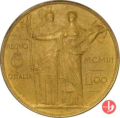 progetto 100 lire 1903 Obverse: testa nuda a destra, e dietro in monogramma EB; attorno: VITTORIO EMANVELE III. Reverse: a sinistra, Minerva, a fianco REGNO D'ITALIA, a destra di Agricoltura MCMIII L.100, in basso, circolarmente, JOHNSON |