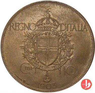 progetto 10 centesimi 1903 Obverse: busto con testa nuda a sinistra; attorno: VITTORIO EMANVELE III; sopra la spalla sinistra, in incuso, monogramma EB (Egidio Boninsegna). Reverse: entro collare, stemma sabaudo coronato, sopra, orizzontalmente, REGNO D'ITALIA; in basso, il valore e la data e in basso a sinistra, circolarmente, JOHNSON. | |