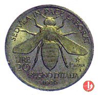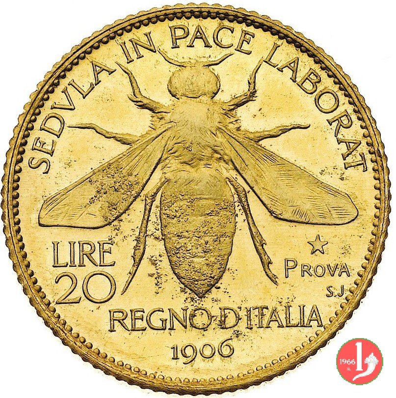 progetto 20 lire 1906 Obverse: testa nuda a sinistra, attorno: VITTORIO EMANVELE III, davanti, nodo d'amore in rettangolo. Reverse: ape, attorno: SEDVLA IN PACE LABORAT; a sinistra il valore; nel campo a destra, in tre righe, (stella) PROVA S.J. sotto, REGNO D'ITALIA e data. | |