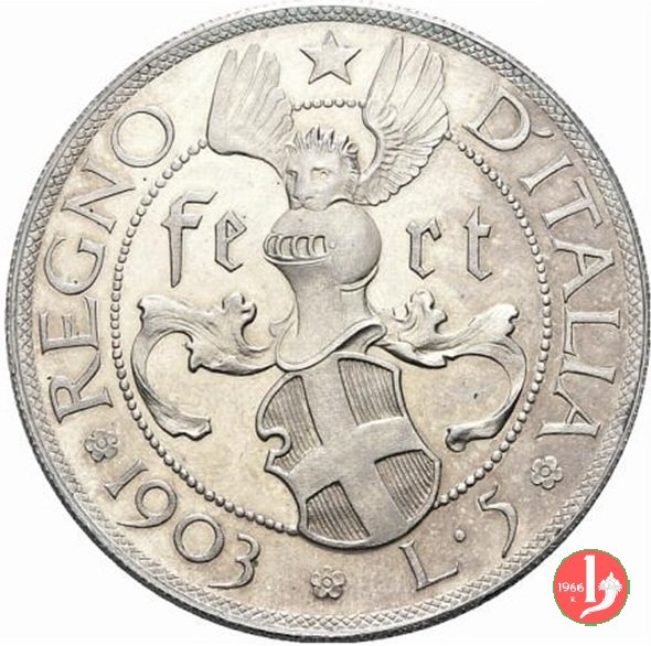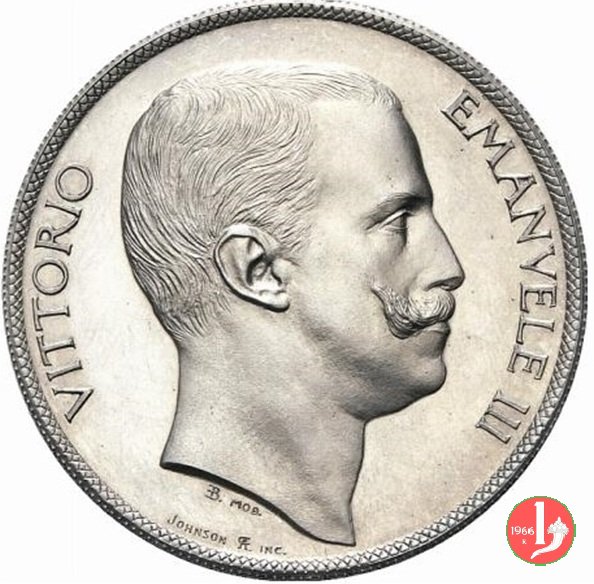progetto 5 lire 1903 Obverse: testa nuda a destra, attorno: VITTORIO EMANVELE III; sotto, EB MOD. e JOHNSON AC INC, circolarmente. Reverse: stemma sabaudo inclinato con elmo e cimiero tra "FE RT", attorno, REGNO (stella) ITALIA, in basso, fra te rosette, data e valore. | |