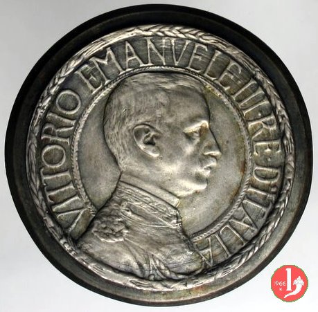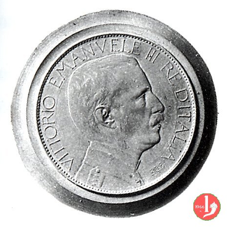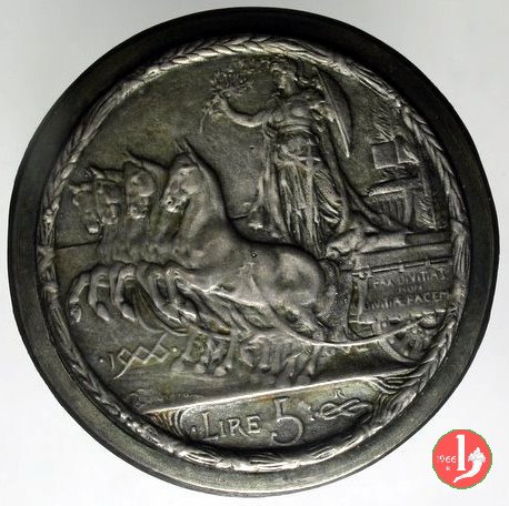 progetto 5 lire "quadriga veloce" Obverse: busto con testa nuda a destra; attorno VITTORIO EMANVELE III RE D'ITALIA. Reverse: l'Italia stante, su quadriga verso sinistra, con lo scudo nella sinistra e ramo d'ulivo nella destra; sul carro PAX DIVITIAS NON DIVITIAE PACEM in tre righe; sotto le zampe dei cavalli, la data e nell'esergo, il valore. | |