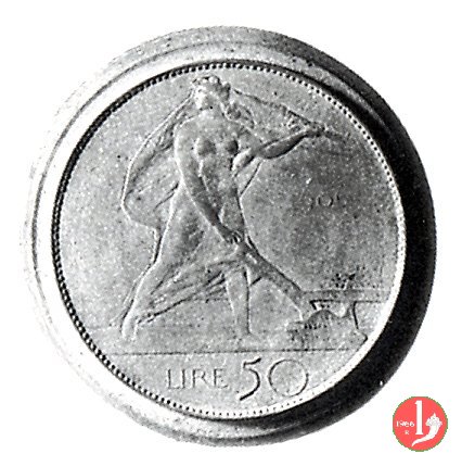progetto 50 lire 1906 Obverse: busto in uniforme con testa nuda a destra, davanti nodo d'amore in rettangolo; attorno: VITTORIO EMANVELE III. Reverse: anepigrafe, Italia Turrita gradiente, nella mano destra regge l'aratro, in basso valore e data. | |