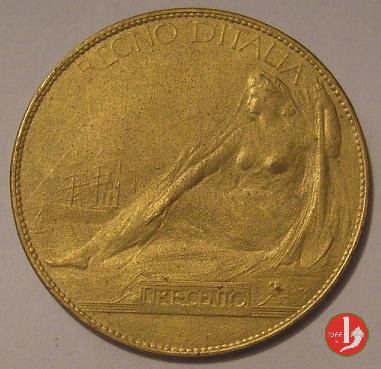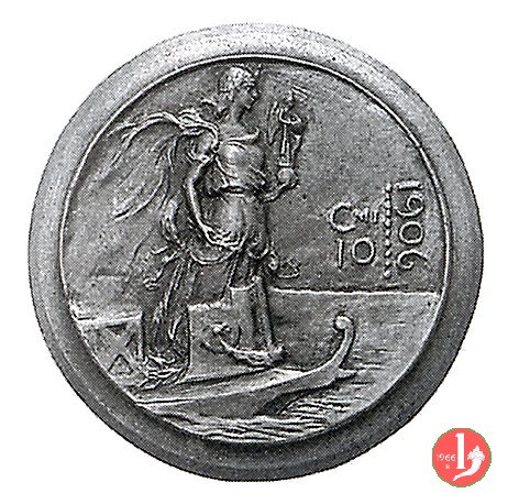 prova del progetto 10 centesimi 1907 Obverse: busto con testa nuda a destra; attorno: VITTORIO EMANVELE III RE D'ITALIA; dietro le iniziali P • C • dell'autore P. Canonica. Reverse: figura allegorica rappresentante l'Italia marinara ritta su prua verso sinistra e recante nella mano destra un ramoscello d'ulivo; in alto, circolarmente, l'indicazione del valore e l'anno di coniazione; a destra, PROVA S • J • scritto orizzontalmente. | |