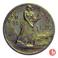 progetto 20 centesimi 1907 Obverse: testa muliebre a sinistra; parte della spalla rialzata e recante una spiga di grano nella mano destra sollevata; a sinistra, circolarmente, ITALIA. Reverse: allegoria della libertà, raffigurata in donna librantese verso sinistra, con fiaccola nella sinistra; alla sinistra in tre righe, l'indicazione del valore, data e segno di zecca; nel basso, lo scudo sabaudo coronato e fregiato. | |