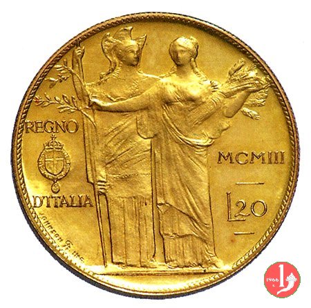 progetto 20 lire 1903 Obverse: testa nuda a destra; attorno: VITTORIO EMANVELE III; in incuso, dietro, EB in monogramma. Reverse: Minerva ed Agricoltura; a sinistra: REGNO D'ITALIA, a destra, MCMIII L.20, a sinistra, circolarmente, JOHNSON | |