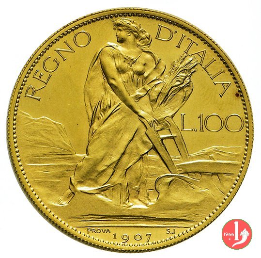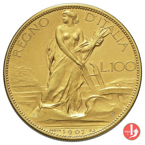 seconda prova 100 lire 1907 Obverse: VITTORIO EMANVELE III, busto in uniforme a sinistra, davanti, nodo sabaudo in rettangolo Reverse: l'Italia in sembianze di aratrice a destra, con le spalle scoperte, nel campo a destra il valore. nell'esergo la data con ai lati PROVA e S.J. | |