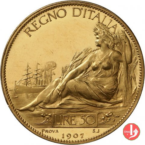 progetto 50 lire 1907 Obverse: busto in uniforme con testa nuda a sinistra e sotto il collo a sinistra, nodo d'amore in rettangolo e monogramma EB; attorno: VITTORIO EMANVELE III. Reverse: donna sdraiata a sinistra, sullo sfondo, navi, attorno: REGNO D'ITALIA e sotto, in cartella, il valore. in esergo, data, con a sinistra PROVA e a destra SJ | |