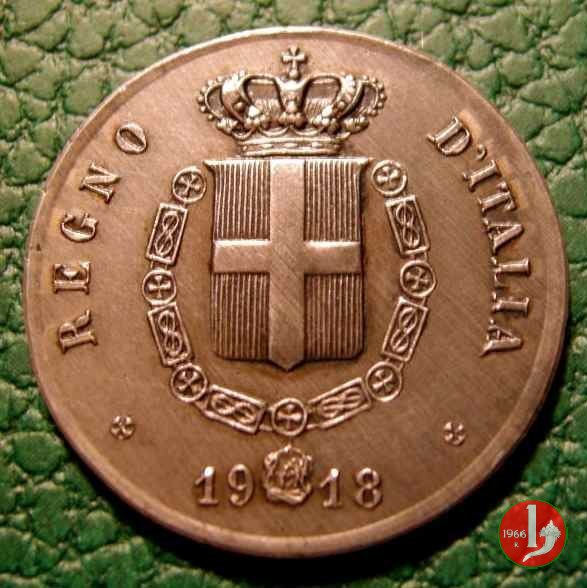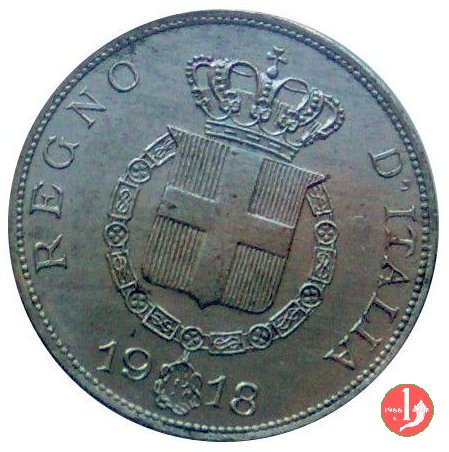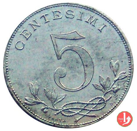 prova 5 centesimi 1918 Obverse: Stemma sabaudo coronato; attorno: REGNO D'ITALIA e sotto la data. Reverse: Nel campo, il valore su nodo d'amore, con rami d'alloro; in basso, circolarmente, PROVA SJ. | |