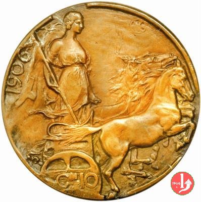 progetto in rame uniface 10 centesimi 1906 Obverse: liscio Reverse: Italia con bandiera su quadriga veloce e briosa a destra; a sinistra, circolarmente, la data; in basso, il valore. | |
