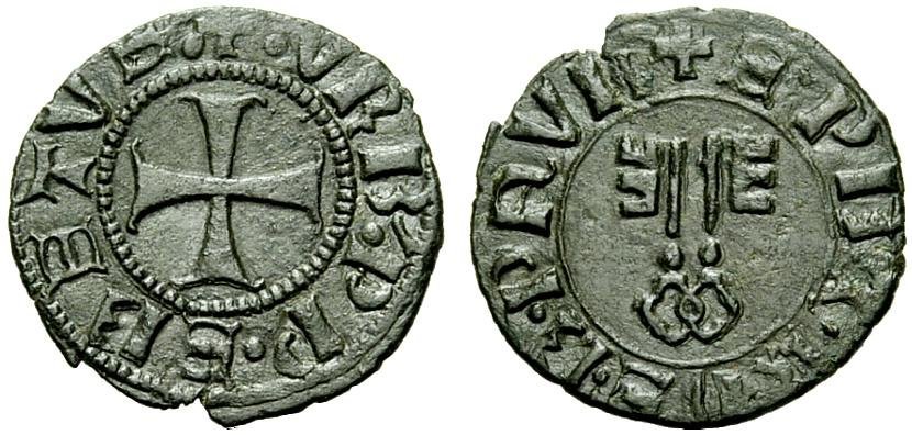 Denaro paparino Dritto: ✠ • VRB ' • PP • SESTVS • Croce patente in c. perlinato. Due chiavi in palo rivolte in fuori con anello gotico in c. perlinato. |
