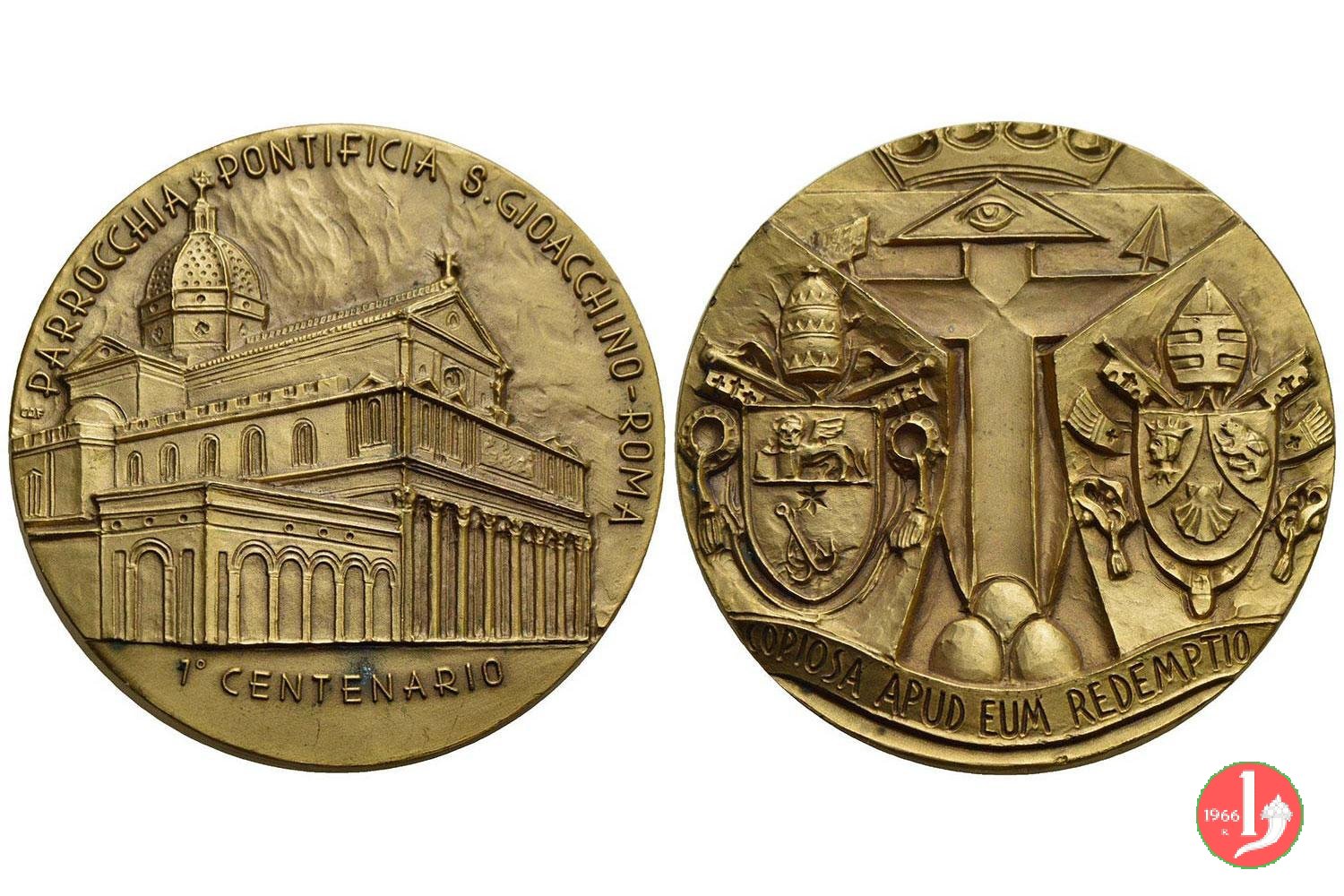 100° Chiesa S. Gioacchino ai Prati di Castello 06-06-2011 Dritto: Stemmi Papali affiancati di Pio X sormontato da triregno e Benedetto XVI sormontato da mitra tripartita, entrambi su chiavi decussate e divisi al centro da Croce coronata e con occhio entro triangolo alla sommità e da corona, posta su altura a tre monti in basso entro nastro: COPIOSA APUD EUM REDEMPTION vista esterna della Chiesa a sx presso il bordo: CDF in esergo: 1° CENTENARIO | |
