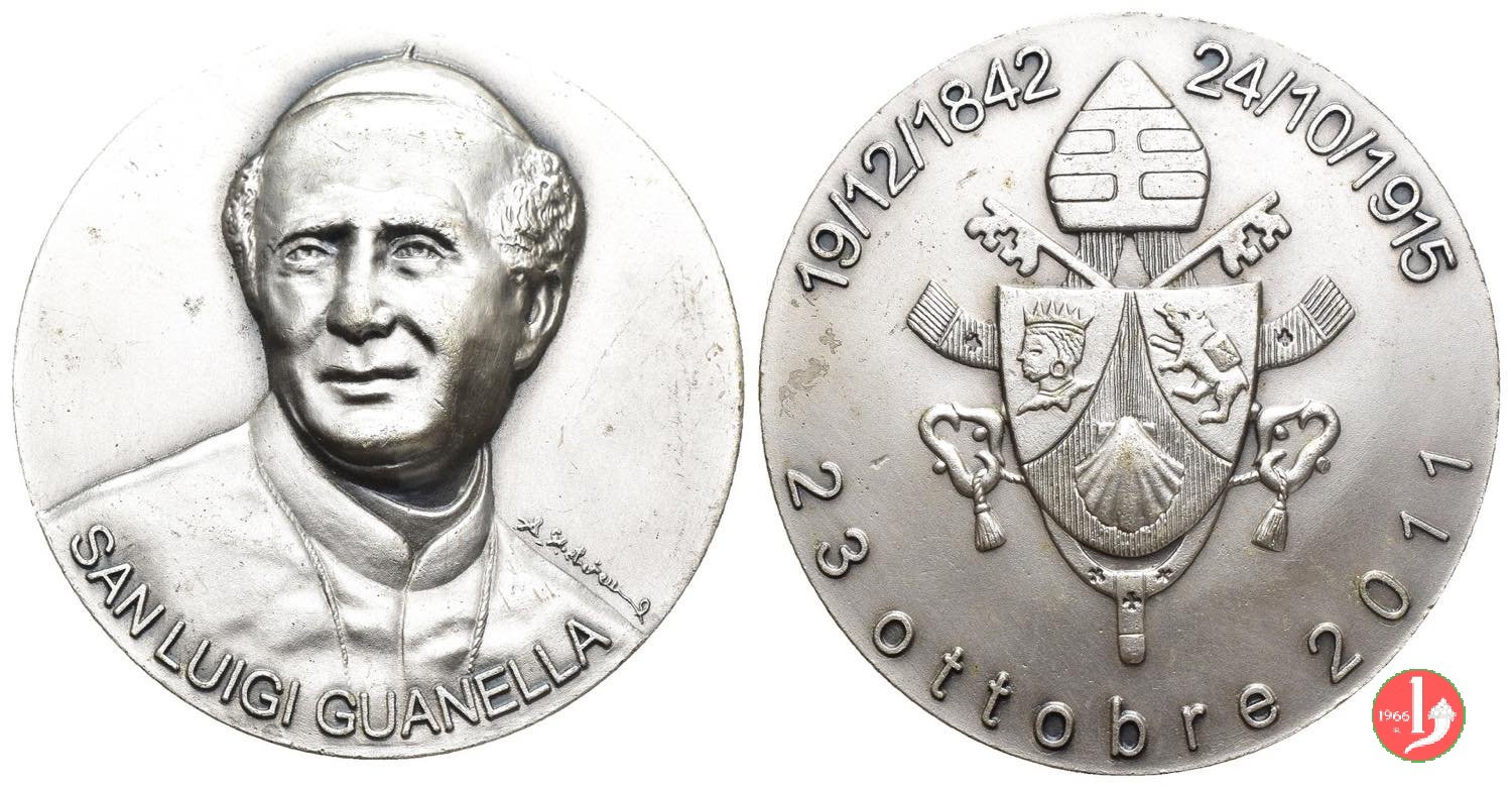 Canonizzazione Luigi Guanella 23-10-2011 Dritto: busto di fronte con zucchetto, abito talare e Croce pettorale (catena) in basso circolarmente sul busto: SAN LUIGI GUANELLA sopra la spalla dx: A MISTICHELLI Stemma Papale su chiavi decussate e pallio sormontato da mitra tripartita in basso circolarmente: 23 OTTOBRE 2011 | |