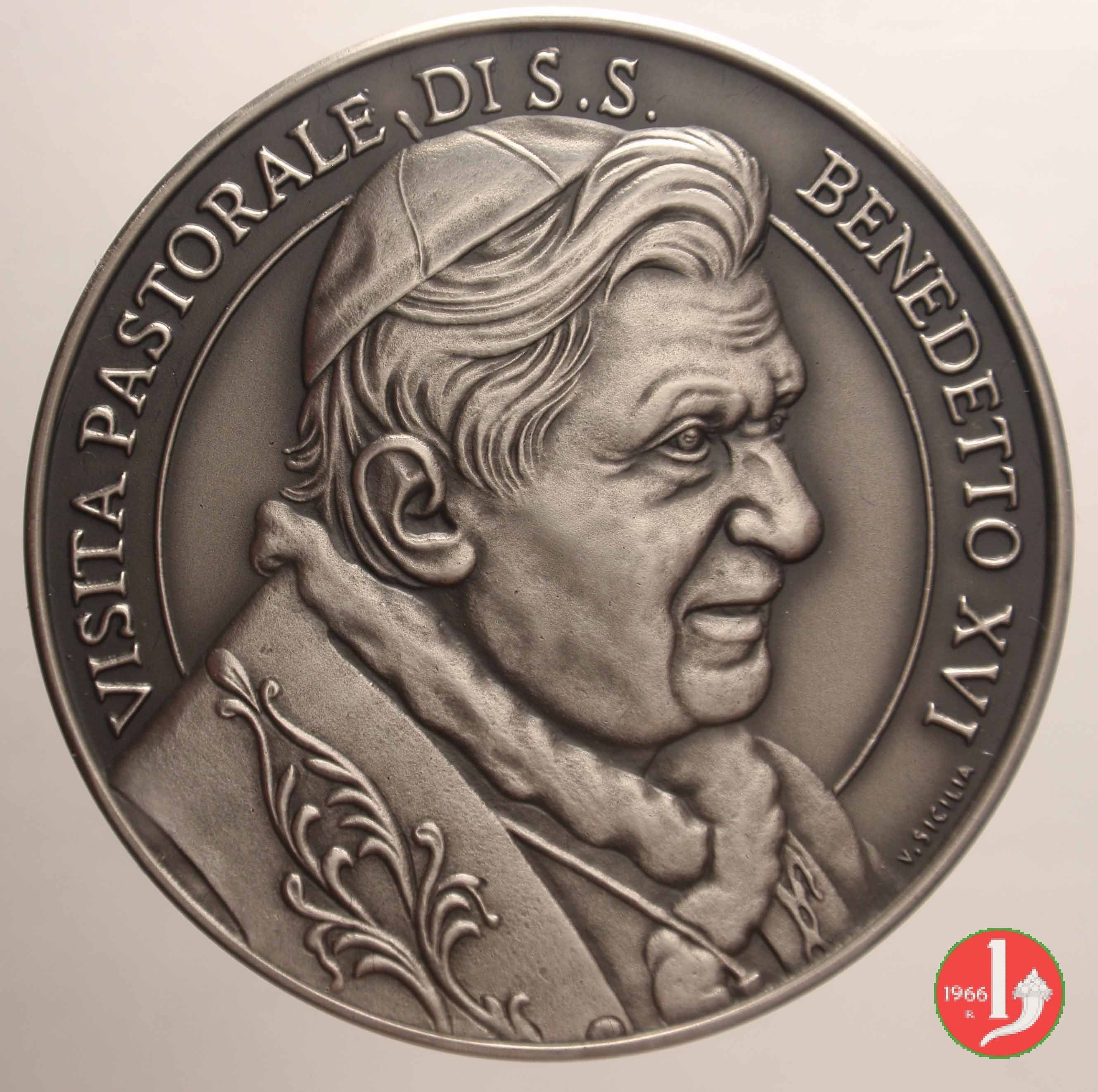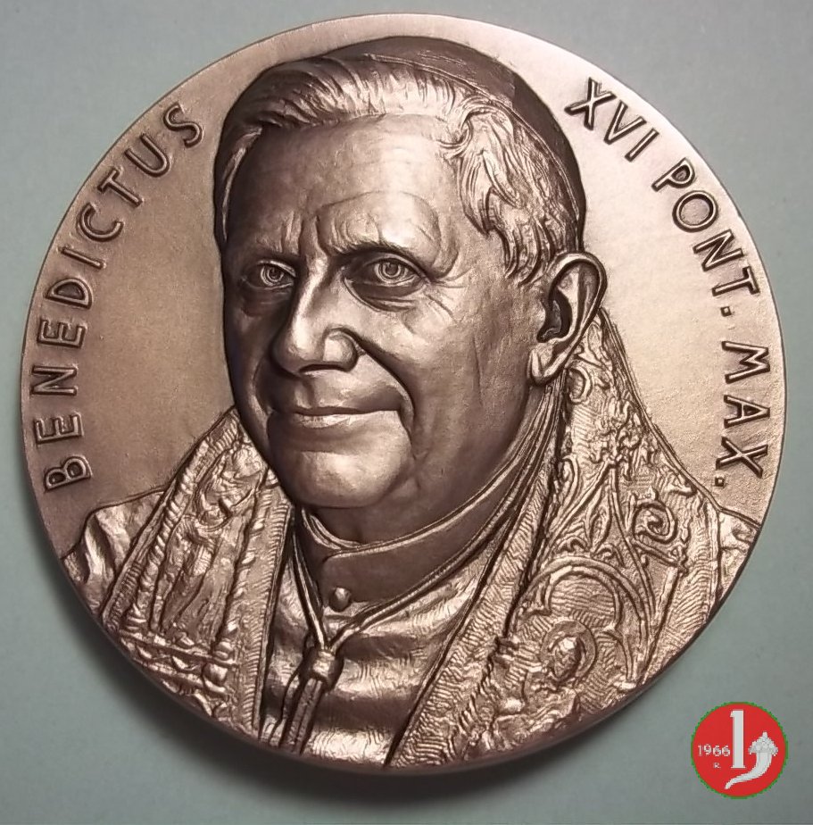 A. VII - Buon Pastore - 60° di Sacerdozio Dritto: • BENEDICTVS • XVI • PONT • MAX • ANNO • VII • busto di fronte con berretto, veste talare e Croce pettorale (catena) sulla spalla sx: M. CRISCIOTTI il Buon Pastore, nimbato di fronte, in piedi, regge agnello sulle spalle, sullo sfondo tralcio di vite e fascina di grano in alto, entro nastro: ADIVTORES _ GAVDII VESTRI in basso, a sx: C. PRINCIPE | |