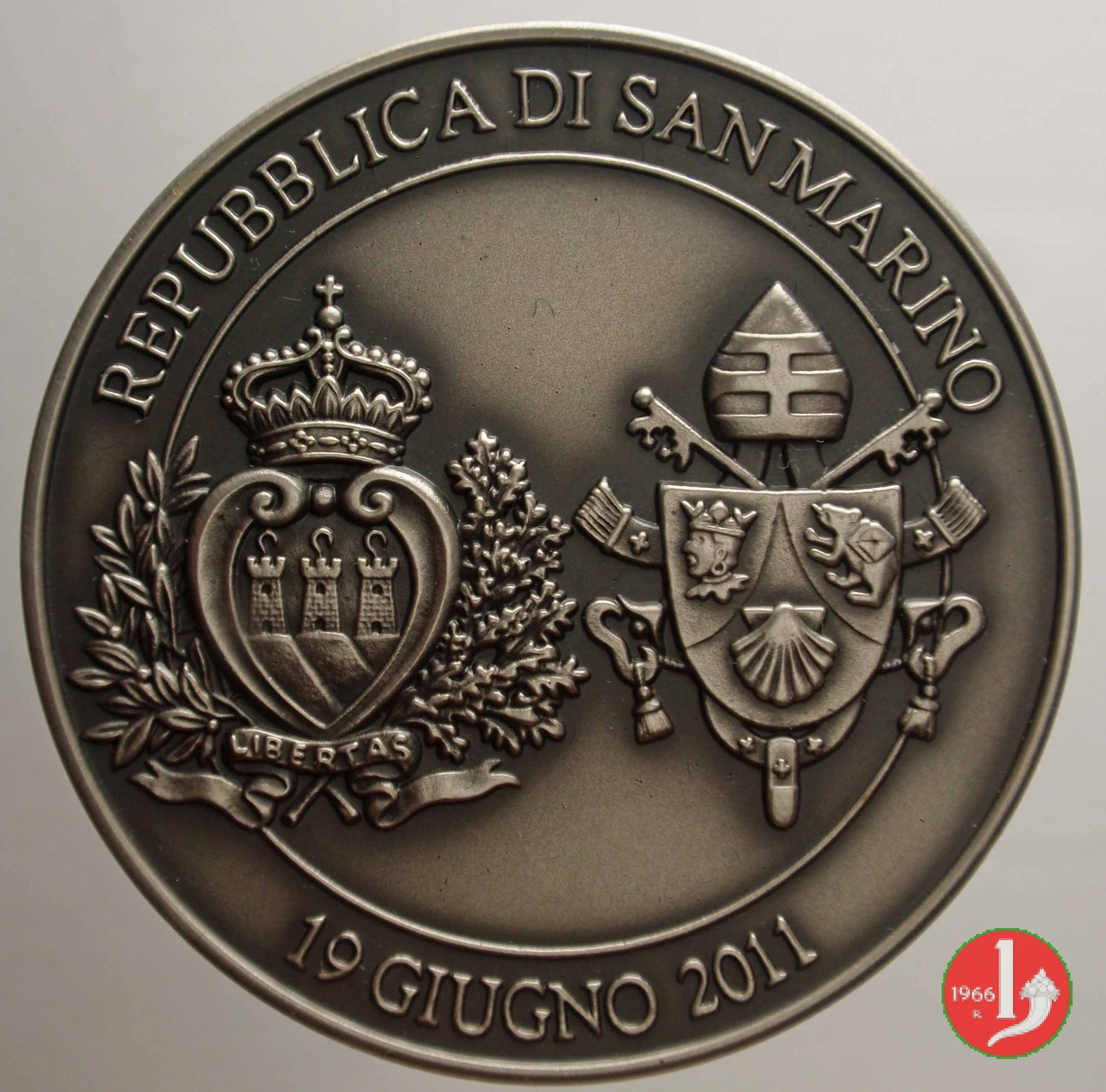Visita a San Marino 19-06-2011 Dritto: VISITA PASTORALE DI S.S. _ BENEDETTO XVI busto a dx con berretto, mozzetta d'ermellino e stola in basso a dx: V. SICILIA Stemmi affiancati della Repubblica di San Marino coronato e tra rami di quercia e d'alloro e del Papa su chiavi decussate e pallio, coronato da mitra tripartita | |