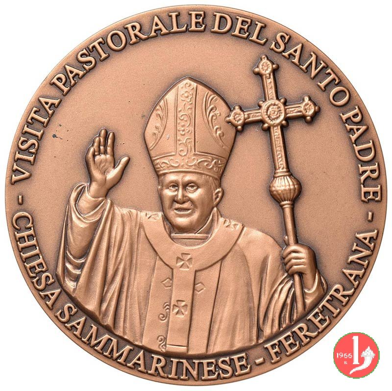 Visita a San Marino 19-06-2011 Dritto: VISITA PASTORALE DEL SANTO PADRE = - CHIESA SAMMARINESE - FERETRANA - busto benedicente di fronte con mitra, pastorale, pianeta e pallio in alto: Stemma Papale, su chiavi decussate e coronato da mitra tripartita in basso, a sx: Stemma Vescovile sormontato da galero a sei nodi e su nastro con motto in basso, a dx, logo della Diocesi Sammarinese-Ferretrana: Croce entro medaglia con legenda ECCLESIA SAMMARINENSIS FERETRANA | |