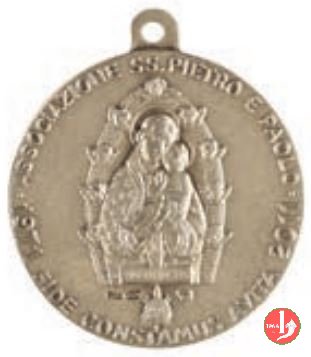 40° Associazione dei SS. Pietro e Paolo 17-06-2011 Dritto: BENEDETTO XVI PONTEFICE MASSIMO busto a sx con berretto, mozzetta e piviale a dx dietro la spalla: LT busti nimbati della Madonna con Gesú Bambino in braccio entro cornice ogivale di Cherubini e su targa: VIRGO FIDELIS in basso: logo dell'Associazione SS. Pietro e Paolo a dx: S.J. | |