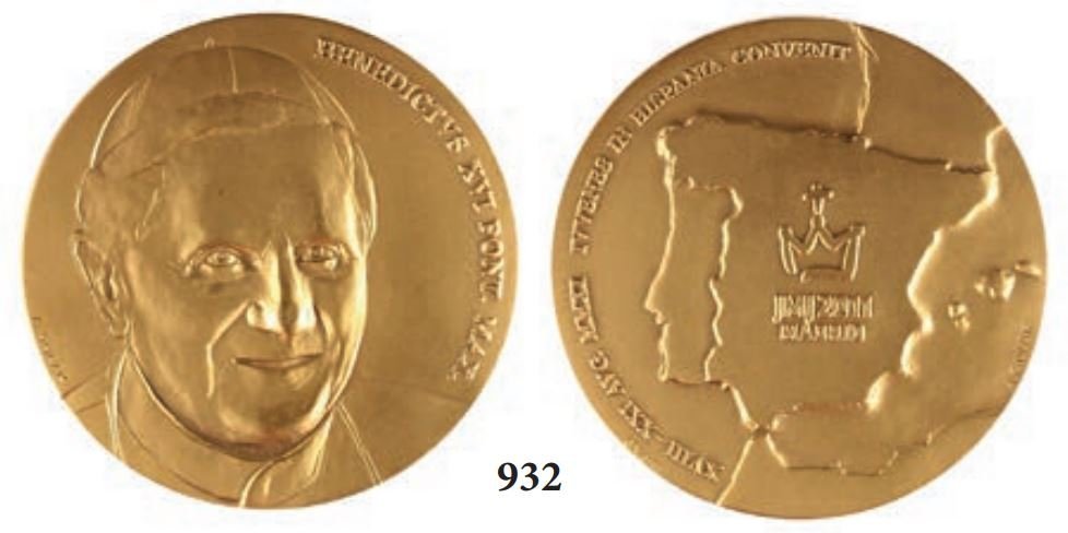 GMG a Madrid - Spagna 16-08-2011 Dritto: BENEDICTVS XVI PONT. MAX. busto sorridente di 3/4 a dx con berretto, veste talare e Croce pettorale (catena) in basso, a sx: A. GULAK Planimetria della Spagna con al centro il logo GMG: JMJ 2011 = MADRID in basso, a dx: A. GULAK in basso, a sx: OMEA - MI | |