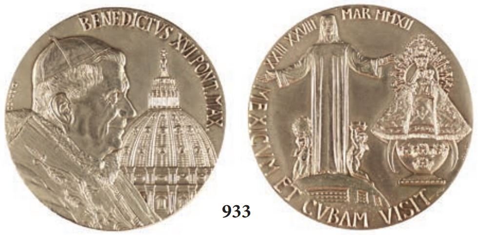 Viaggio in Messico e Cuba 23-03-2012 Dritto: BENEDICTVS XVI PONT. MAX. busto a dx con berretto, mozzetta d'ermellino e stola e a dx la cupola della Basilica Vaticana a sx: D. LONGO affiancati di fronte: il Cristo Re del Cubilete e la B. V. della Carità del cuore di Cuba presso il bordo dx: JOHNSON | |