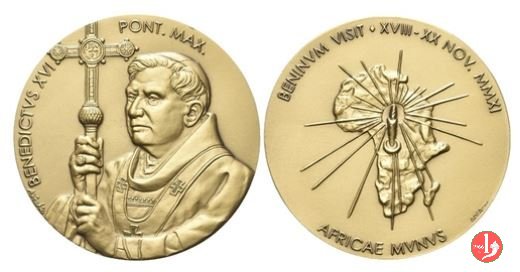 Viaggio in Benin 18-11-2011 Dritto: BENEDICTVS XVI _ PONT. MAX. busto di 3/4 a sx con berretto, pianeta e pallio, regge pastorale in basso, a sx: firma A. VECCHIO Candela raggiante al centro del Continente Africano sotto: AFRICAE MVNVS in basso, a dx: OMEA-MI | |