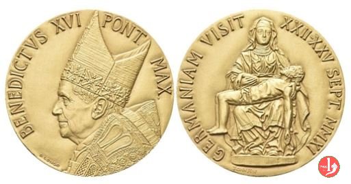 Viaggio in Germania 23-09-2011 Dritto: BENEDICTVS XVI _ PONT. _ MAX. busto a sx con tiara e piviale in basso, a sx: D. LONGO La Madonna di Etzelsbach: l'immagine della B. V. Maria seduta di fronte e velata con Cristo morto sulle ginocchia sotto: JOHNSON | |