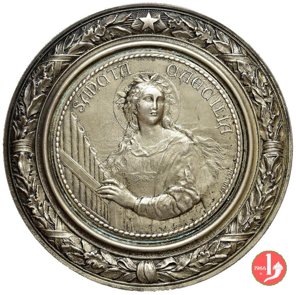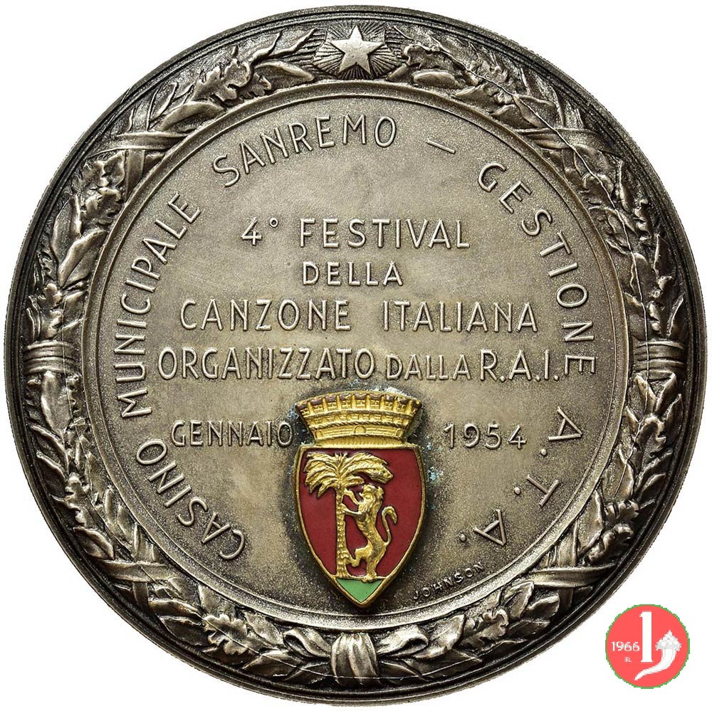 Sanremo-IV Festival della Canzone Italiana 1954 Dritto: SANCTA CAECILIA busto nimbato e laureato di 3/4 a dx della Santa con mantello presso canne d'organo in basso a dx: JOHNSON nel campo: 4° FESTIVAL = DELLA = CANZONE ITALIANA = ORGANIZZATO DALLA R.A.I. ai lati di Stemma turrito di Sanremo dorato con smalti rossi e verdi: GENNAIO _ 1954 in basso a dx: JOHNSON | |