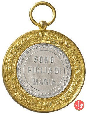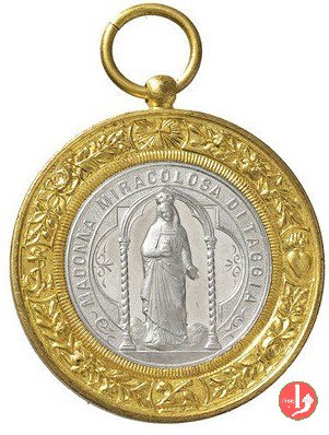 Madonna di Taggia Dritto: entro cornice floreale, con ai lati: Croce raggiante, Cuore ardente, Leone gradiente a sx, Ancora MADONNA MIRACOLOSA DI TAGGIA entro arco ogivale lobato con colonne tortili: la B. V. coronata, in piedi, di fronte nel campo, entro cornice stellata e cornice interna continua: SONO = FIGLIA DI = MARIA | |