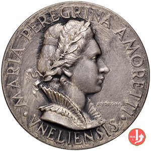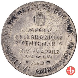 Maria Pellegrina Amoretti 1956 Dritto: MARIA PELLEGRINA AMORETTI = • VNELIENSIS • busto laureato a dx nel campo, a dx: AVDAGNA nel campo, sotto allo stemma turrito di Imperia: • IMPERIA • = CELEBRAZIONE = BICENTENARIA = XIV • XV APRILE = MCMLVI = foglie d'alloro | |
