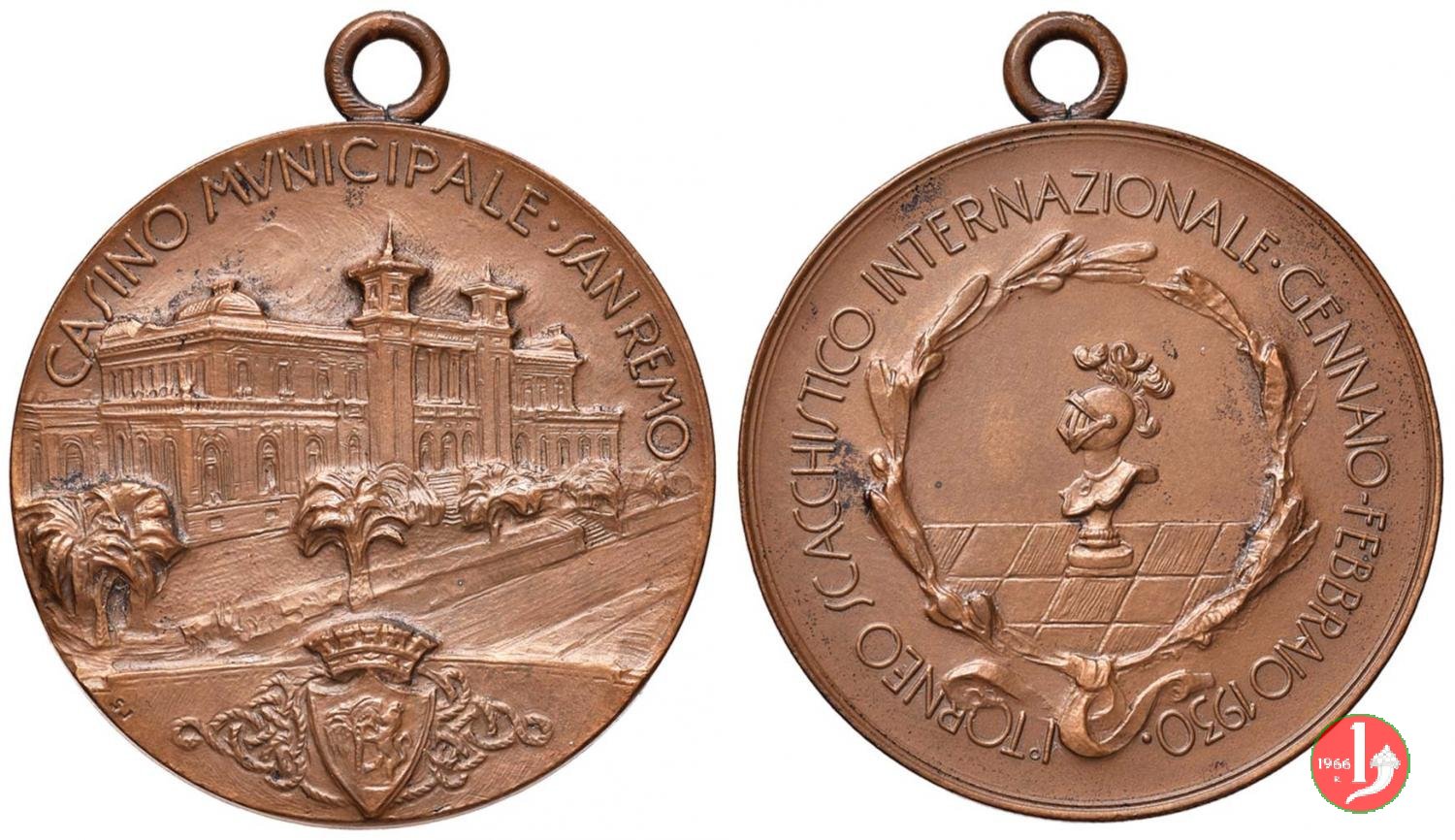 Sanremo - Torneo Schacchistico Internazionale 1930 Dritto: CASINO MVNICIPALE • SANREMO Vista del Casinò di Sanremo in esergo: Stemma turrito della Città su corda annodata in basso a sx: SJ busto con cimiero entro serto d'alloro | |