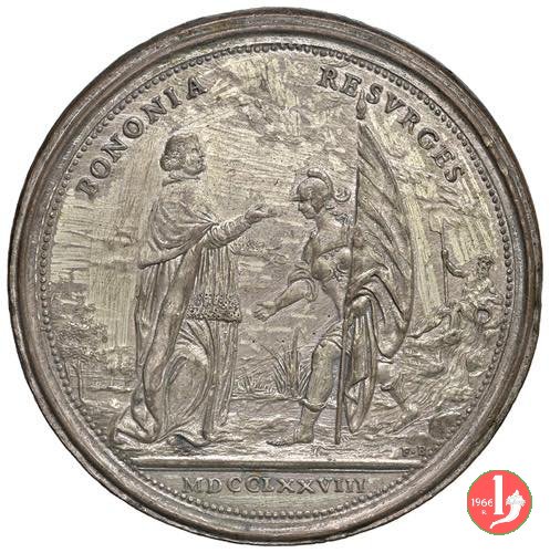 Ignazio Boncompagni Ludovisi 1778 Dritto: IGNATIVS • S • R • E • DIAC • CARD • BONCOMPAGNVS LVDOVISIVS BON • DE LAT • LEGATVS * busto a sx con zucchetto, mozzetta e Croce pettorale Il Cardinale, a sx, in piedi, volto a dx, riceve l'omaggio di Felsina, la figura allegorica di Bologna corazzata ed elmata; sullo sfondo la figura allegorica del Fiume Po e le paludi in esergo: MDCCLXXVIII |
